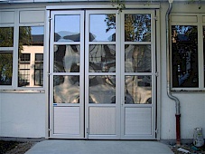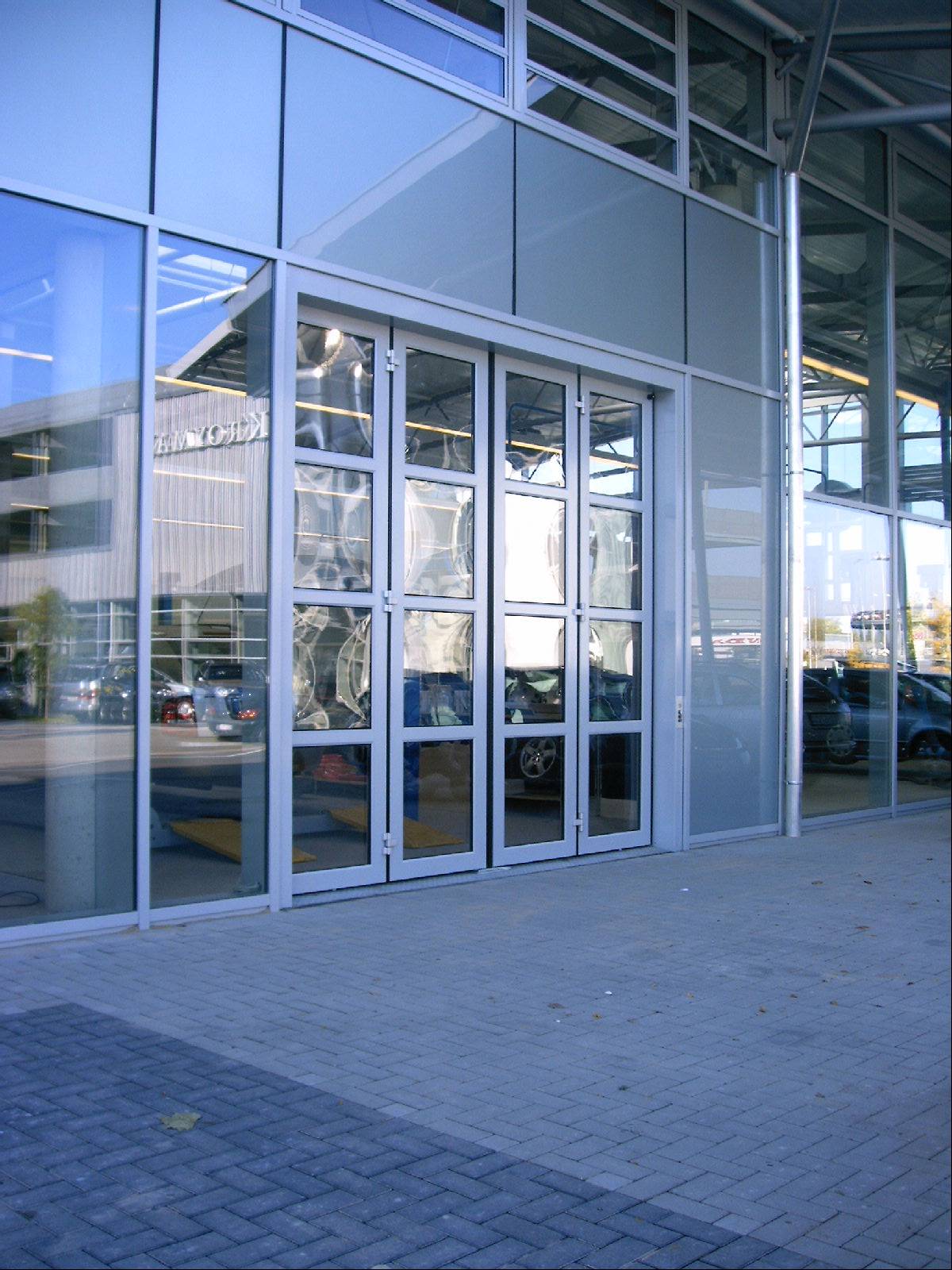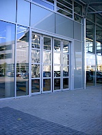 Torblatt aufgeteilt in Flügel, nach links und rechts 90/180 Grad öffnend. Montage innen bzw. außen an der Wand. Bei Außenmontage wird eine Laufschienenabdeckung mitgeliefert. Jeder Flügel ist in Felder unterteilt. Torblattkonstruktion aus naturfarben eloxierten (E6/EV1) Aluminium- Hohlkammerprofilen in Rahmen/Sprossen- bauweise. Statisch bemessen nach den Windvorschriften für Bauwerke, DIN 1044 Blatt 4. Die Flügel sind untereinander durch naturfarben eloxierte und mit Edelstahlbolzen ausgestattete Spezialbänder verbunden.